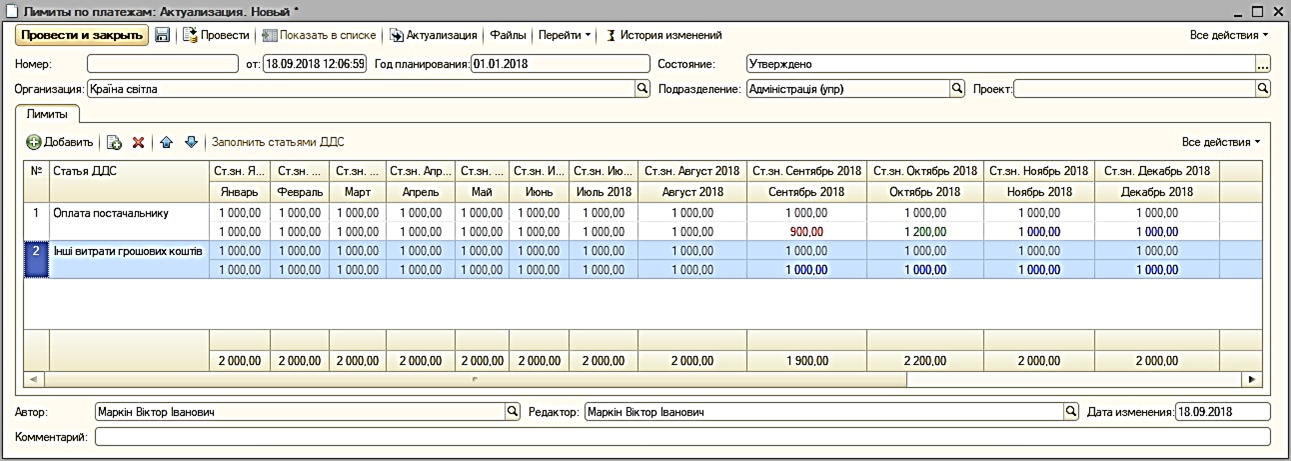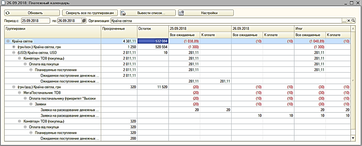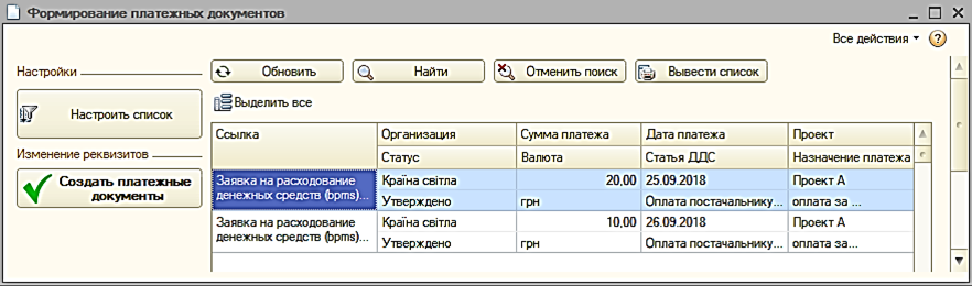 - Выводятся запланированные суммы к оплате и суммы по сформированным платежным документам