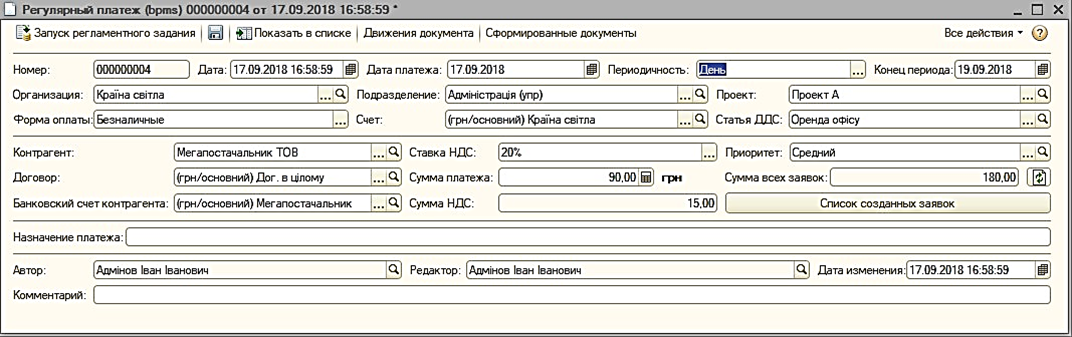 Предварительная регистрация плановых регулярных платежей с периодичностью: День, Неделя, Месяц, Квартал, Полугодие, Год