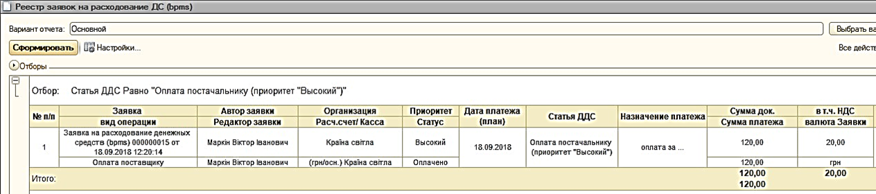 В данном отчете отображается информация по всем созданным в системе заявкам на расходование денежных средств. Доступные аналитические разрезы: вид операции, автор и редактор заявки, организация, расчетный счет/касса, приоритет, статус, дата платежа, статья ДДС, контрагент, договор контрагента, подразделение, проект.
