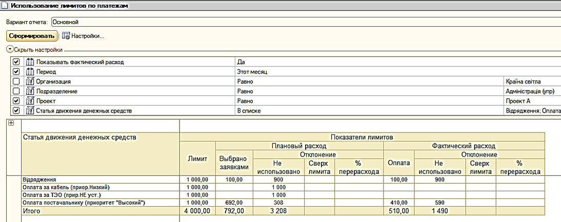 Отчет «Использование лимитов по платежам»