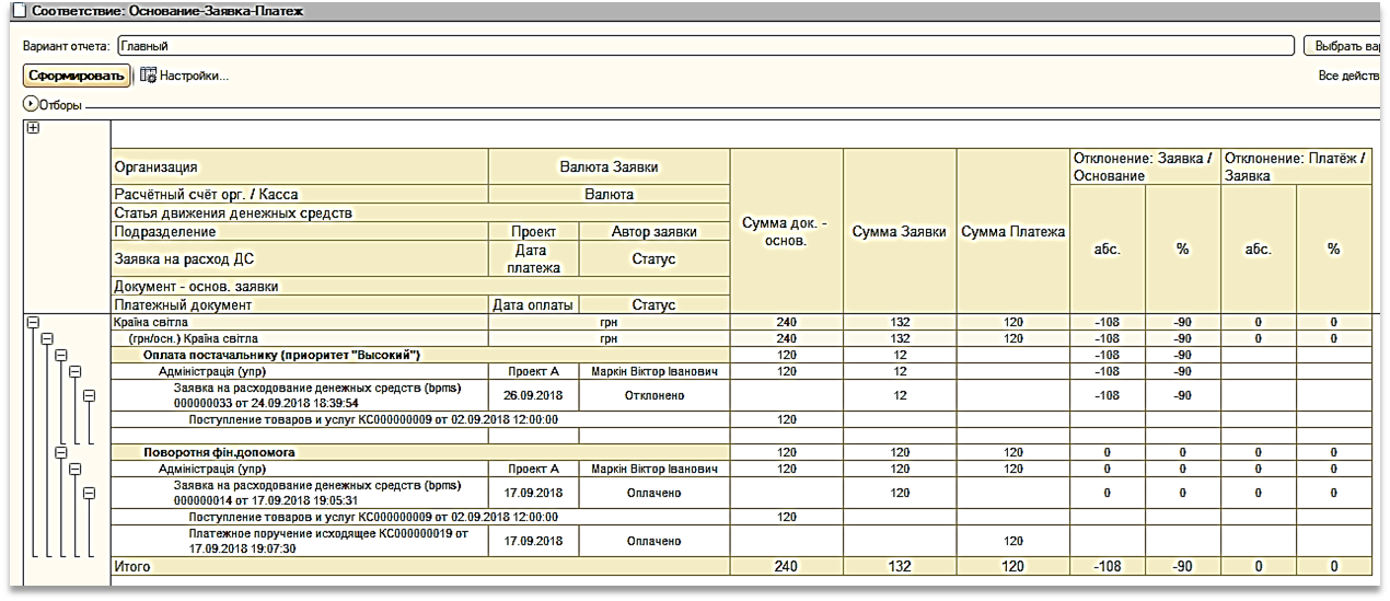 Отчет «Соответствие: Основание-Заявка-Платеж»