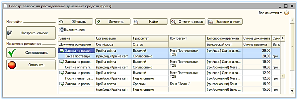 - Вывод ожидаемых поступлений и заявок на расход ДС в зависимости от статуса согласования