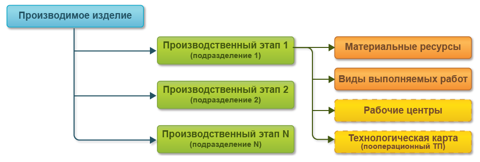 - Управление детализацией описания требуемых для производства ресурсов (маршрутные карты).
