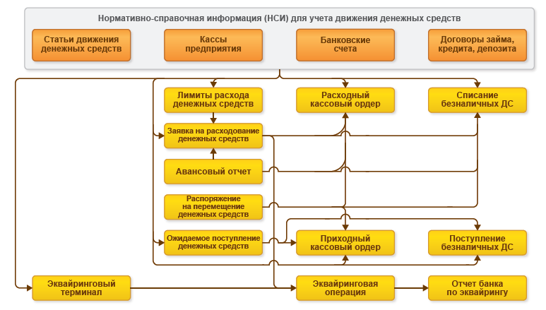 В учете безналичных денежных средств разделены регистрация оперативной информации о входящих и исходящих платежах (по первичным платежным документам) и регистрация выписок (реализованных отдельным документом). Это позволяет повысить оперативность учета (в частности, взаиморасчетов), не искажая при этом учет средств на расчетных счетах, облегчить обработку платежек и выписок, получить полный контроль за денежными средствами, находящимися в процессе зачисления, списания или перемещения.